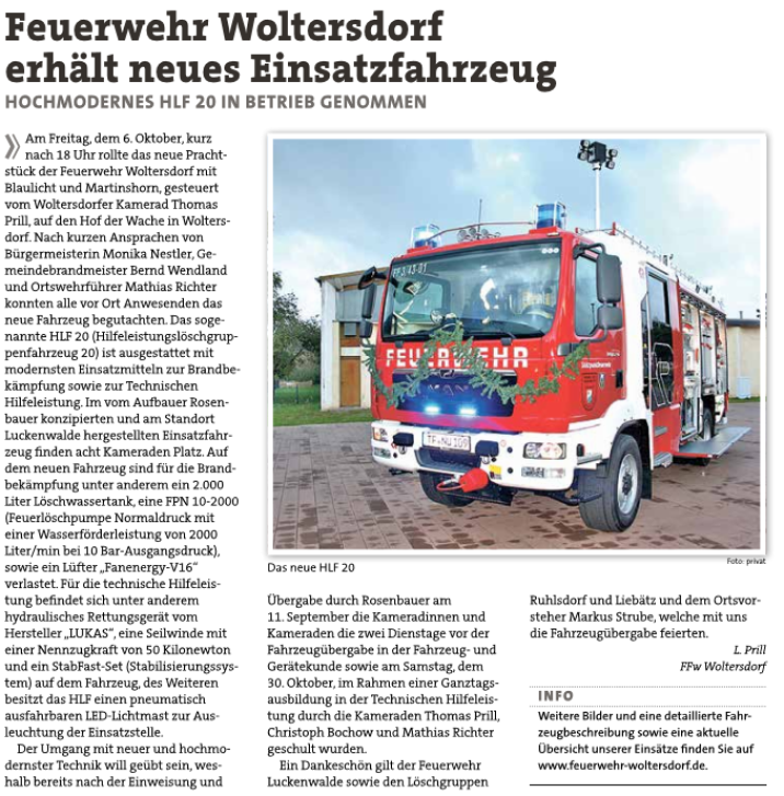 Am 06. Oktober 2017 war es endlich soweit, uns wurde unser neues "Hilfeleistungslöschgruppenfahrzeug 20" feierlich übergeben. Um 18 Uhr fuhr das HLF 20 mit Blaulicht und Martinshorn auf den Hof, wo zuvor Bürgermeisterin Monika Nestler (Linke) und Gemeindebrandmeister Bernd Wendland obligatorisch den Schlüssel an Ortswehrführer Mathias Richter übergeben haben. Bereits am Donnerstagnachmittag zuvor, wurde unser neues Fahrzeug bei Sturmeinsätzen durch Sturmtief Xavier im Einsatz auf die Probe gestellt und leistete treue Dienste. Für das HLF 20 ging unsere "Oma" das LF 16-TS in die Hände der Löschgruppe Ruhlsdorf über.